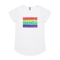 Scoop neck, capped sleeves, curved tails